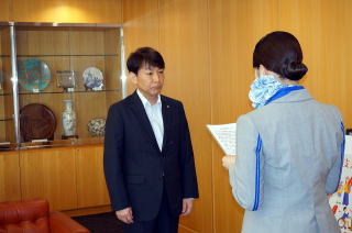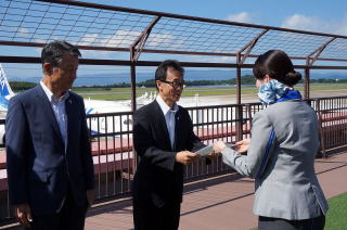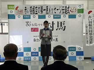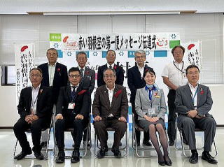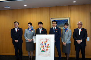 今年も赤い羽根共同募金運動が始まりました。 ANA(全日本空輸株式会社)では、共同募金運動への協力の一環として、毎年10月に「赤い羽根空の第一便」を実施しています。 この「赤い羽根空の第一便」は、毎年ANAのキャビンアテンダントの方々が、共同募金運動の発足行事の一環として、全国各地の共同募金会等へ厚生労働大臣、中央共同募金会会長メッセージを届けていただくもので、長崎県内では、10月1日に長崎空港(大村市)、長崎県庁、対馬市役所において、客室乗務員の方々から赤い羽根を添えて各メッセージの伝達が行われました。 また、長崎県庁においても厚生労働大臣メッセージが浦 真樹副知事に伝達されました。毎年のご協力ありがとうございます。